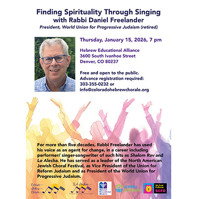 The Colorado Hebrew Chorale welcomes presenter Rabbi Daniel Freelander for "Finding Spirituality Through Singing". Rabbi Freelander is a noted musician, song-writer, and leader of progressive Judaism.