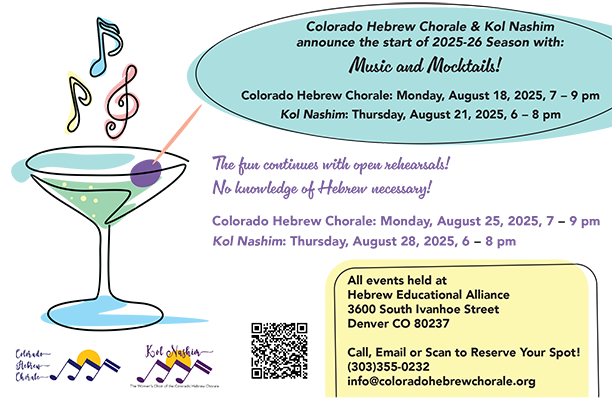 Join the Colorado Hebrew Chorale as we celebrate the end of summer and kick off our 2025-26 season with Music and Mocktails! No knowledge of Hebrew necessary, but RSVPs required.