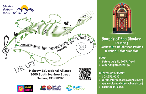 Join area singers and choral directors for the Colorado Hebrew Chorale's annual Summer Sight-Singing Romp! This year's focus, "Sounds of the Sixties", will feature Leonard Bernstein's "Chichester Psalms", marking its sixtieth birthday (July 1965), as well as other "oldies and goodies." The event is free to those who register by July 31, 2025: otherwise, $5, at the door. Info and registration: (303)355-0232,